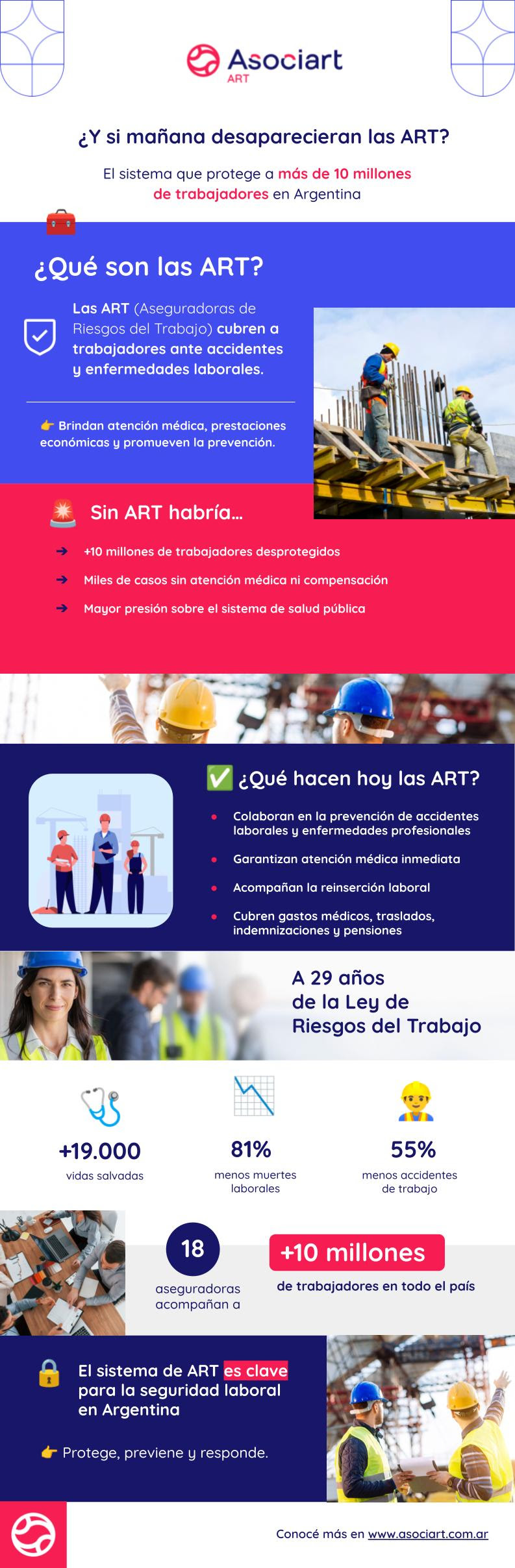 ¿Sabías que hoy más de 10 millones de trabajadores están protegidos por las aseguradoras de riesgos del trabajo (ART)? Este sistema, vigente desde hace 29 años, brinda cobertura ante accidentes y enfermedades laborales, garantiza atención médica, prestaciones económicas y acompaña en la reinserción laboral.